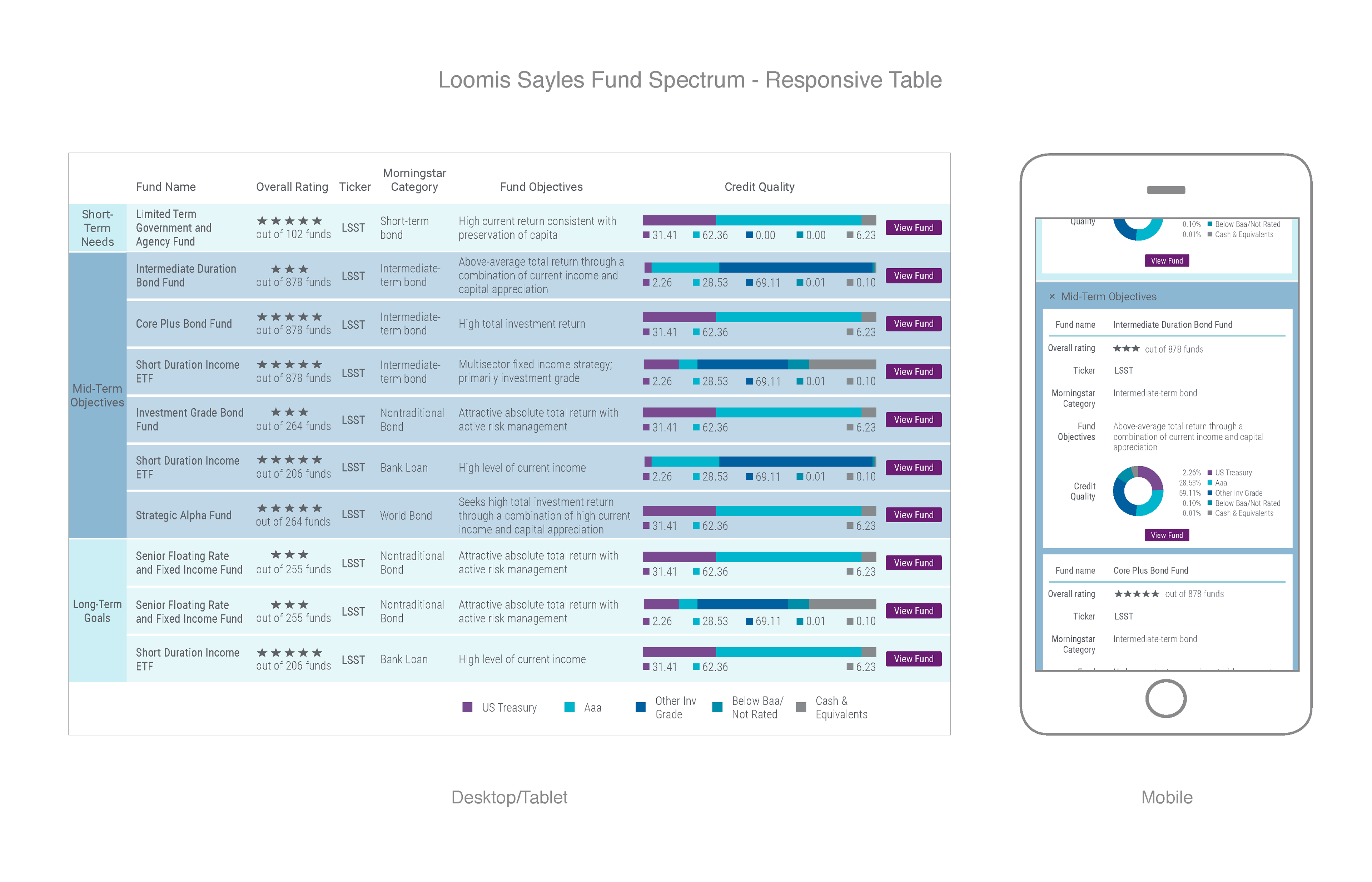 Using color to separate fixed income funds by their time horizons and adapting layouts based on screen size for optimal user experience: flipping the X and Y axis, switching from bar to donut charts and grouping legend and numerical data. Web, Pluto & Roboto